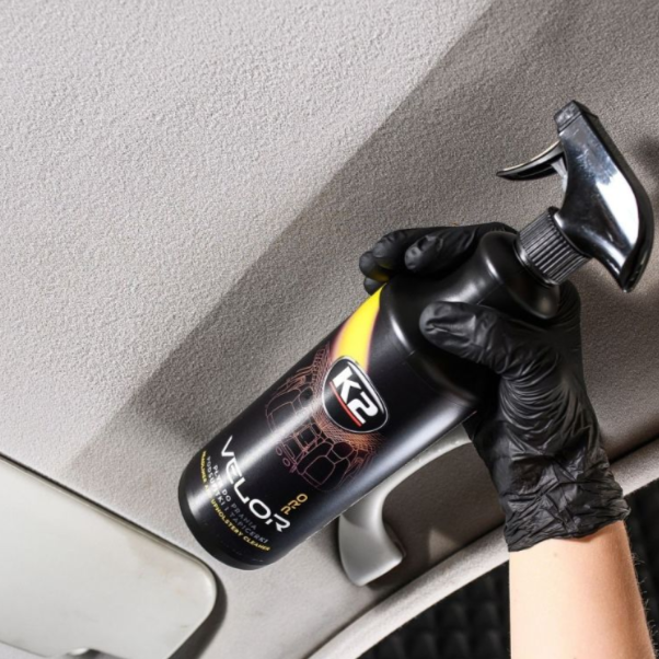 K2 Velor Pro é um produto pronto para uso projetado para limpar forros de teto, estofamentos de tecido e tapetes de carro. É seguro para as superfícies limpas, remove eficientemente sujeira e manchas, e não requer enxágue.